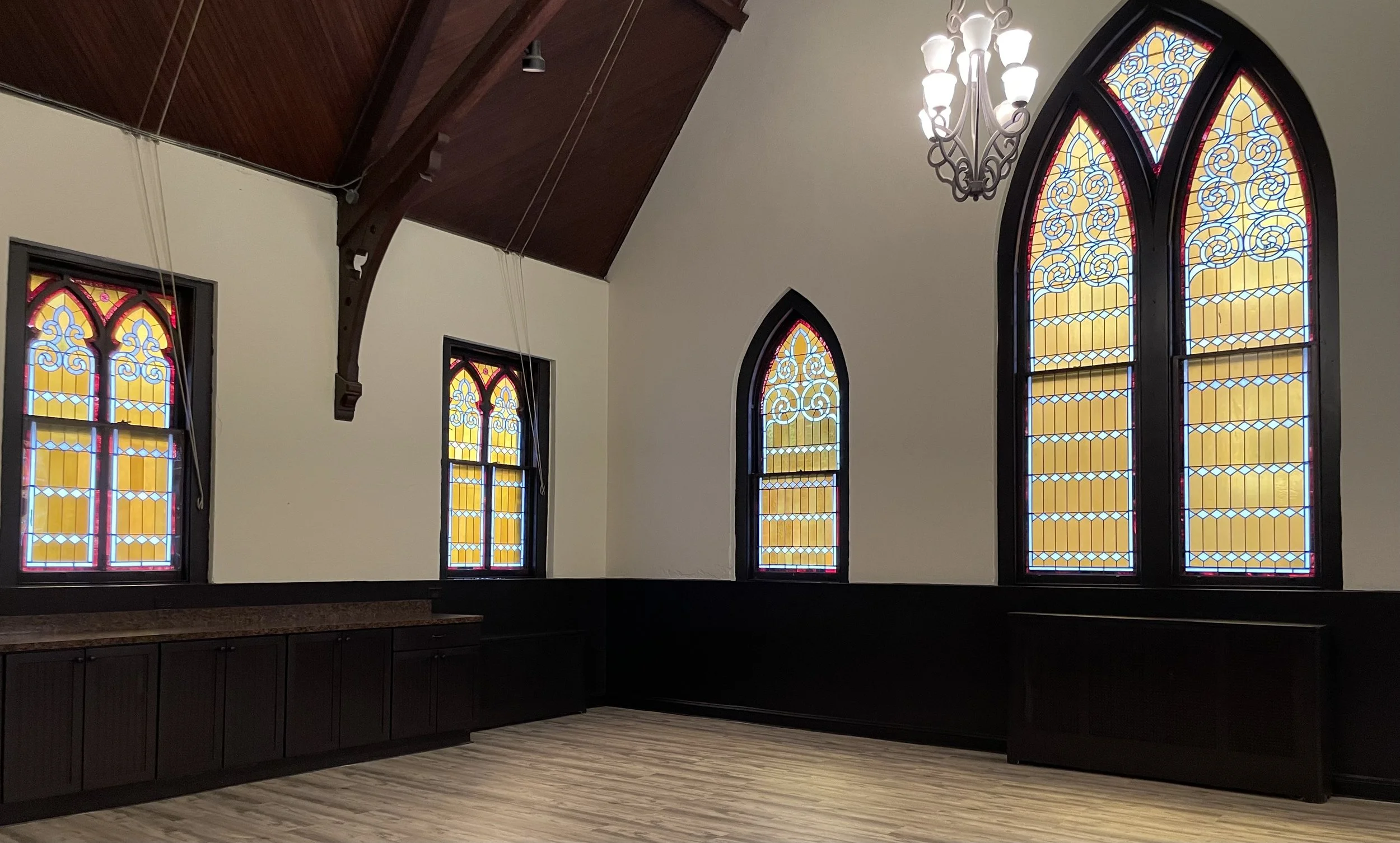 This is a separate gathering space—a small sanctuary-style space, but more informal. It features fixed storage cabinets at either end as well as a small kitchenette (sink and refrigerator) at the back wall. It can be easily set up with chairs, tables, or as an open event space for a reception, classes/group gathering, or small party hall.