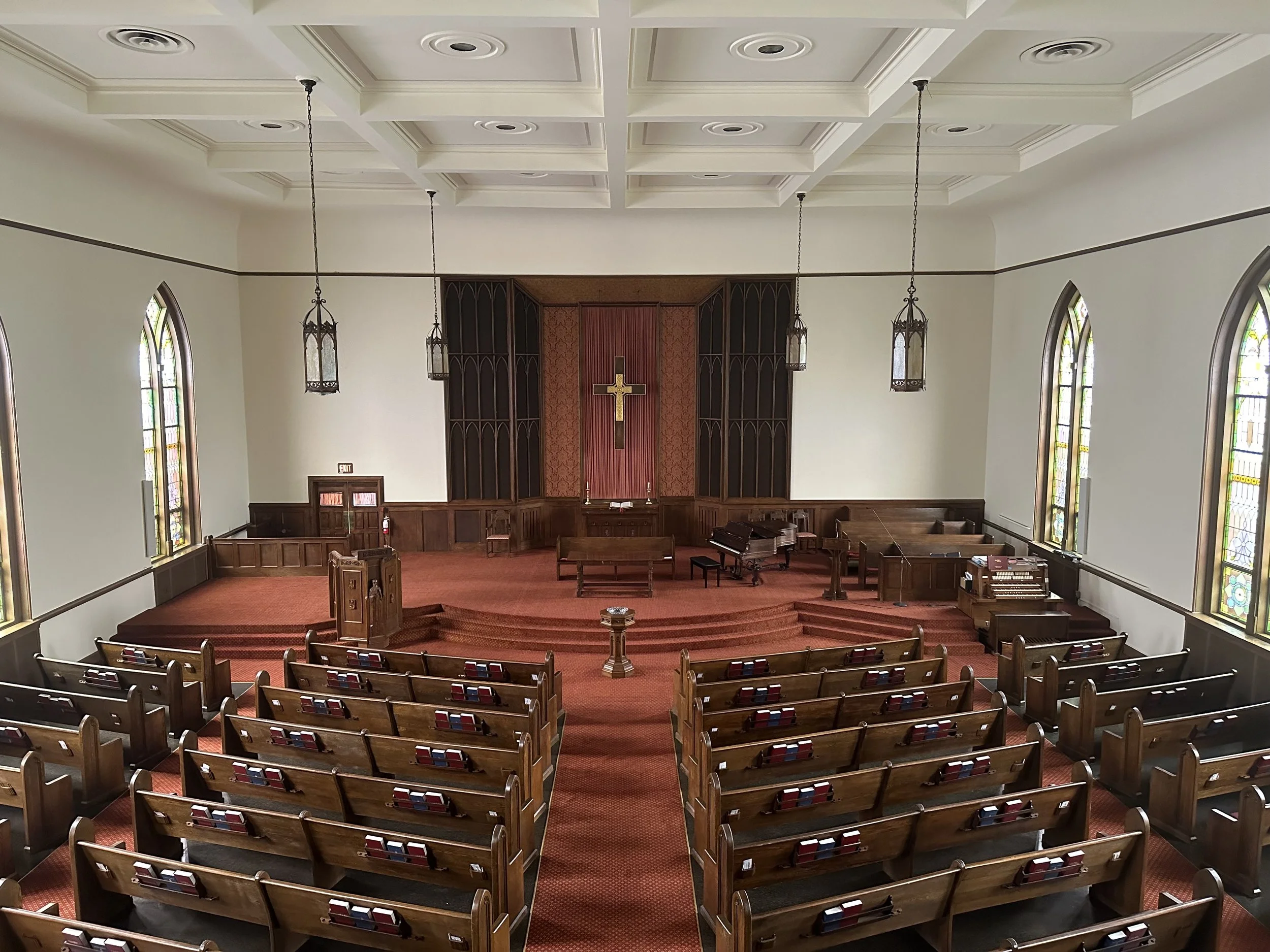 Our main sanctuary features a raised chancel/altar, thirteen rows of pews (separated into four sections via center aisles), and a separate narthex space at its entrance. There is also a single-row balcony as well as a glass-enclosed room overlooking the space from the rear of the room.